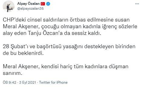 AK Parti İzmir Milletvekili Alpay Özalan, başörtülü bir kadınla ilgili iğrenç imalarda bulunan CHP'li Bolu Belediye Başkanı Tanju Özcan'a sessiz kalan İYİ Parti Genel Başkanı Meral Akşener'e tepki gösterdi.