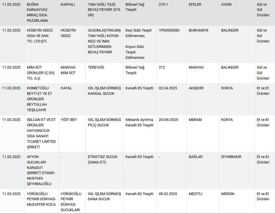 Yapılan son denetimlerde beyaz peynirde bitkisel yağ, tam yağlı koyun, keçi ve inek sütlerinden yapıldığı iddia edilen peynirde ise keçi ve koyun sütünün kullanılmadığı görüldü. Tereyağında bitkisel yağ tespit edildi. Isıl işlem görmüş dana, kangal ve piliç sucukta kanatlı et çıktı.