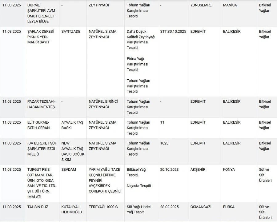 Listenin demirbaşı olan zeytinyağında tohum yağları ve daha düşük kalitede zeytinyağların karıştırıldığı tespit edildi. Balıkesir’de hizmet verem bir firmanın zeytinyağında ayrıca pirina yağlı karıştırıldığı görüldü. Ayrıca eritme peynirinde bitkisel yağ ve nişasta çıktı.