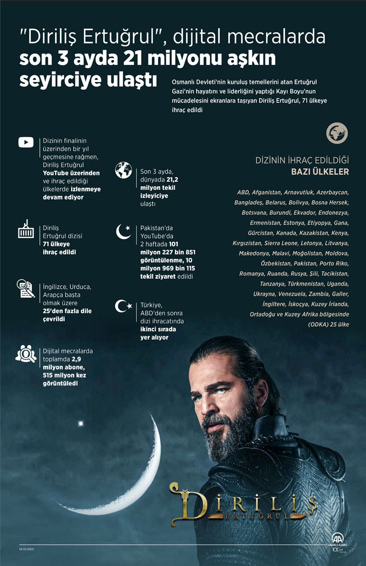 Osmanlı Devleti'nin kuruluş temellerini atan Ertuğrul Gazi'nin hayatını ve liderliğini yaptığı Kayı Boyu'nun destansı hikayesini anlatan Diriliş Ertuğrul dizisi ihraç edildiği 71 ülkede izlenme rekorları kırdı.