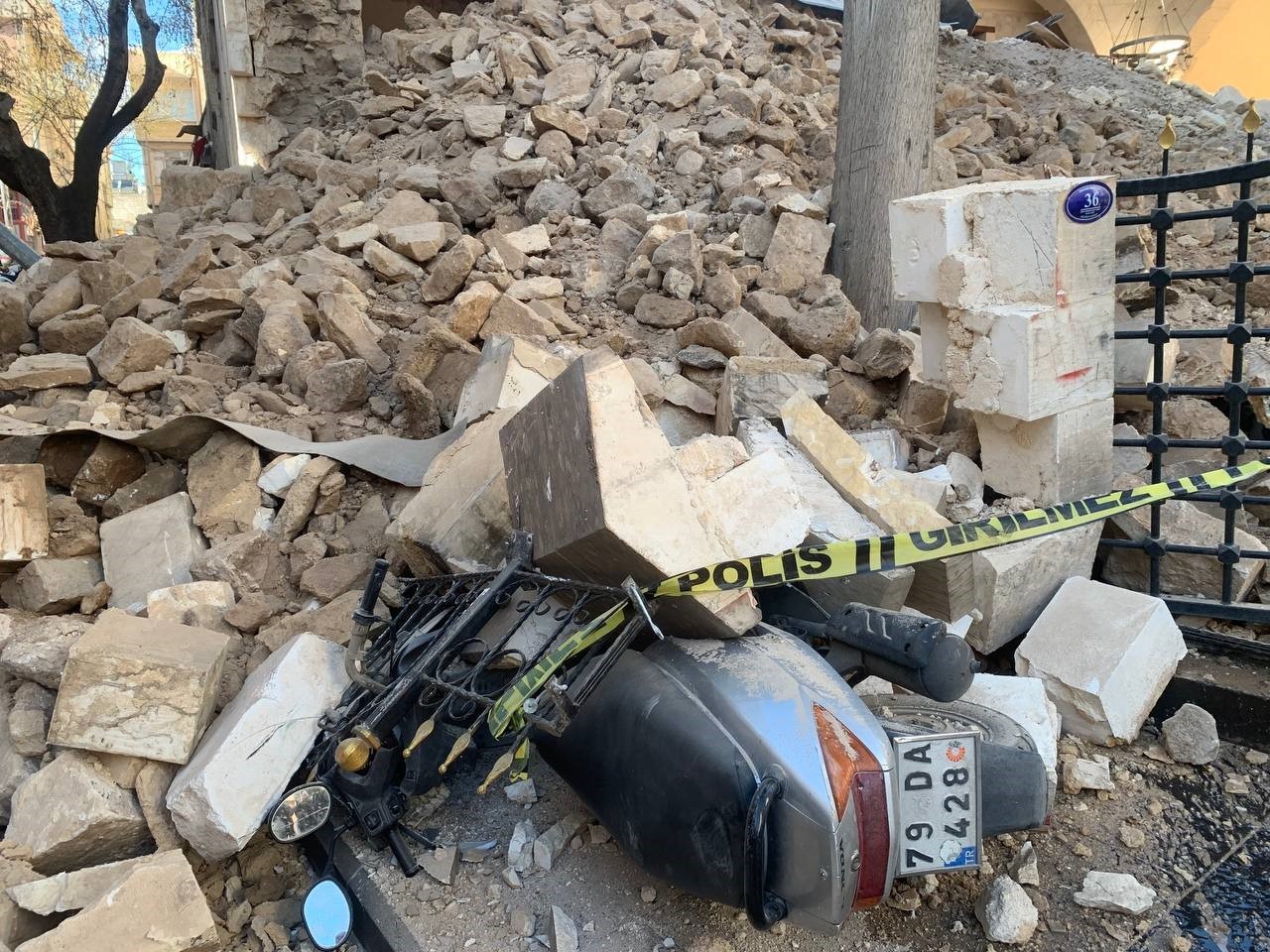 Kahramanmaraş merkezli depremlerin etkilediği Kilis'te ağır hasar alan tarihi caminin duvarı çöktü.