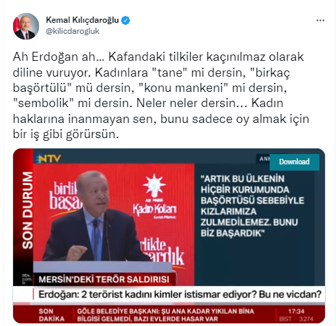 Kılıçdaroğlu, Türkiye'deki dindarlara özgürlük alanı açan Cumhurbaşkanı Erdoğan'ı pişkin ifadelerle hedef aldı: Ah Erdoğan ah… Kafandaki tilkiler kaçınılmaz olarak diline vuruyor. Kadınlara ‘tane’ mi dersin, ‘birkaç başörtülü’ mü dersin, ‘konu mankeni’ mi dersin, ‘sembolik’ mi dersin. Neler neler dersin… Kadın haklarına inanmayan sen, bunu sadece oy almak için bir iş gibi görürsün.