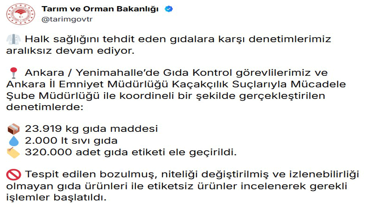 "Denetimlerde, 23 bin 919 kilogram gıda maddesi, 2 bin litre sıvı gıda ve 320 bin adet gıda etiketi ele geçirildi. Tespit edilen bozulmuş, niteliği değiştirilmiş ve izlenebilirliği olmayan gıda ürünleri ile etiketsiz ürünler incelenerek gerekli işlemler başlatıldı. Vatandaşlarımızın güvenilir gıdaya erişimini sağlamak için denetimlerimize durmaksızın devam ediyoruz" ifadelerine yer verdi.
