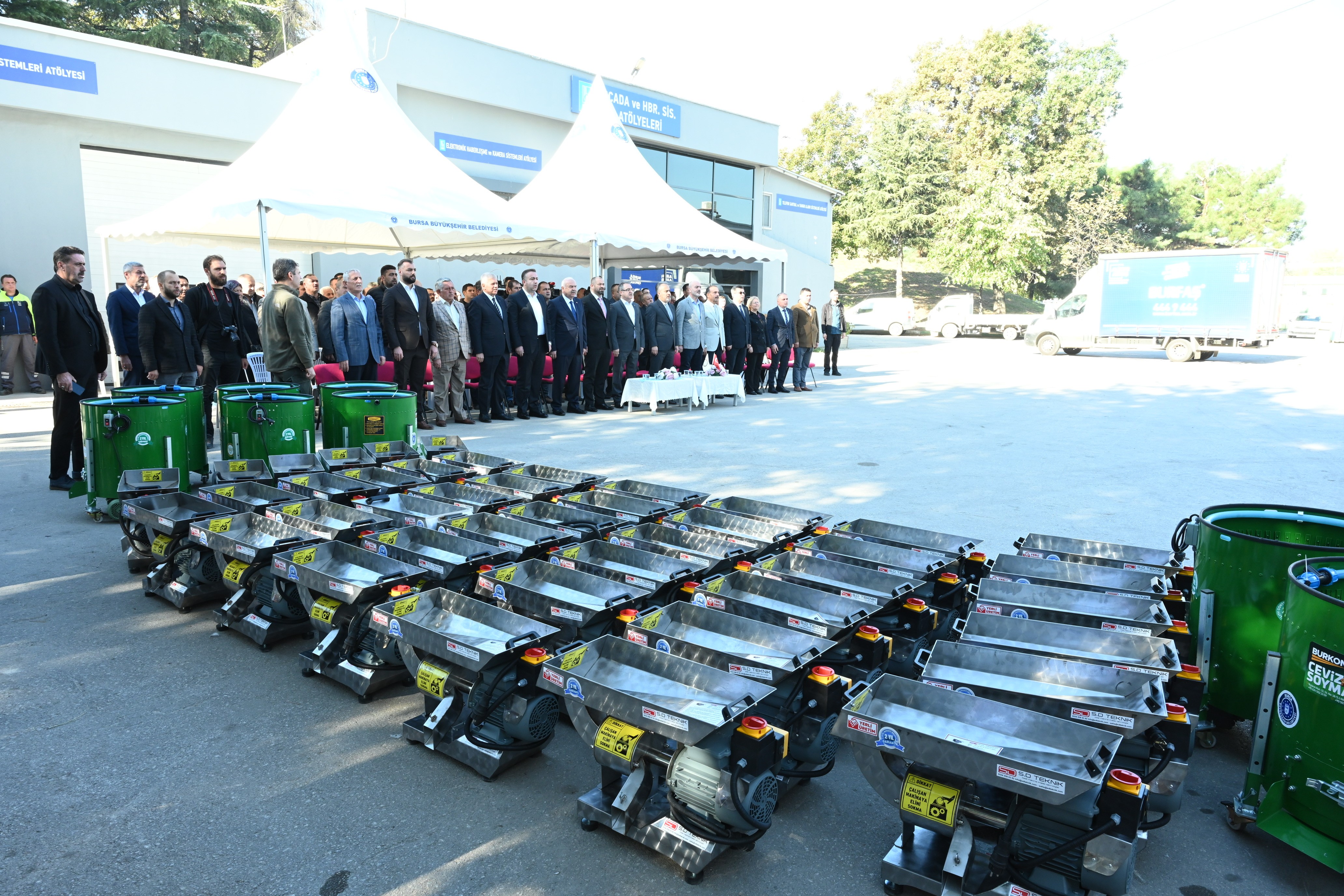 Bursa’da kırsal kalkınmayı sağlayarak köyden kente göçün önüne geçmeyi hedefleyen Büyükşehir Belediyesi, çiftçilere yönelik makine ve ekipman desteğini hız kesmeden sürdürüyor. Son alarak Mustafakemalpaşa, İznik, Keles, Nilüfer, Yenişehir, İnegöl, Orhangazi, Gürsu, Gemlik, Karacabey, Osmangazi, Mudanya, Orhaneli, Yıldırım ve Büyükorhan ilçelerindeki 81 kırsal mahalleye, ceviz soyma ve silkeleme makinesi, yem ezme makinesi, salça makinesi ve asılır çekilir merdane dağıtıldı. BUSKİ bahçesinde düzenlenen tarım makineleri dağıtım törenine, Büyükşehir Belediye Başkanı Alinur Aktaş’ın yanı sıra Orhaneli Belediye Başkanı Ali Aykurt, Bursa Milletvekili Zafer Işık, İl Tarım ve Orman Müdürü Hamit Aygül, AK Parti İl Başkanvekili Ufuk Ay, mahalle muhtarları, ziraat odalarının başkanları ve üreticiler katıldı.