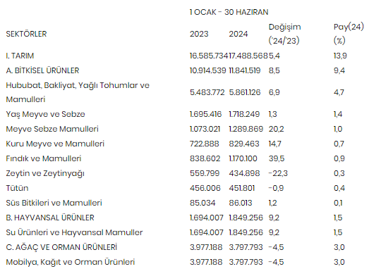 TİM VERİLERİNE GÖRE, BU YILIN VE 2023'ÜN OCAK-HAZİRAN DÖNEMİNDE TARIM VE TARIMA BAĞLI SEKTÖRLERİN İHRACATI (BİN DOLAR) ŞÖYLE: