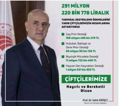 Bakan Vahit Kirişci, Twitter hesabından yaptığı açıklamada, "291 milyon 220 bin 778 liralık tarımsal destekleme ödemelerini yarın çiftçilerimizin hesaplarına aktarıyoruz. Üreticilerimize hayırlı ve bereketli olsun" dedi. Bakan Kirişci söz konusu paylaşımında "Çay prim desteği 188 milyon 486 bin 279 lira, hububat, baklagil ve dane mısır desteği 89 milyon 90 bin 138 lira, biyolojik mücadele desteği 11 milyon 722 bin 406 lira ve hayvan gen hakları desteği için ise 1 milyon 921 bin 955 lira. Çiftçilerimize hayırlı ve bereketli olsun" ifadelerini kullandı.