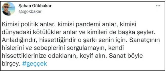 Tarkan, şöyle devam etti: "O anlarda bu şarkının melodi ve sözleri içimde yankılandı. 'Geççek geççek elbet bu da geççek, gör bak umudun gününü gün etçek. Hepimize iyi gelecek bir şarkı yazmalıyım dedim. Belki bu şarkı bizi biraz teselli eder, bize moral verir, umut olur diye düşündüm. Dilerim ki 'Geççek' yüzünüzde bir gülümsemeye vesile olur ve hepimize iyi gelir.