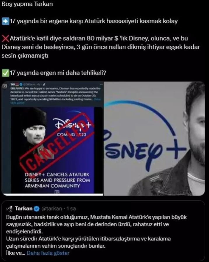 Şarkıcı Tarkan, Disney Plus'un Atatürk dizisini yasaklamasına karşın hiçbir tepki göstermeyip aradan zaman geçtikten sonra açıklama yapması büyük tepki çekti. Açıklama için 17 yaşındaki çocuğu beklediği söylendi.