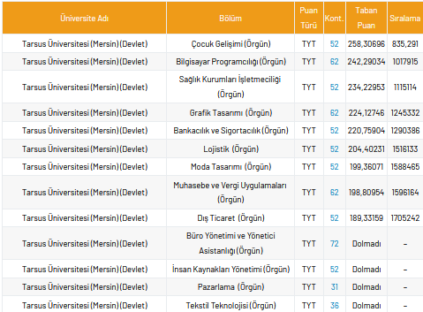 Tarsus Üniversitesi 2 yıllık taban puanları 2021, yüzdelik dilimleri ve kontenjan sayıları kaçtır?