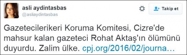Aydıntaşbaş, "Gazetecileri Koruma Komitesi, Cizre'de mahsur kalan gazeteci Rohat Aktaş'ın ölümünü duyurdu. Zalim ülke. " şeklindeki tweetiyle kendi ülkesine zalim diyecek kadar ileri gitti.