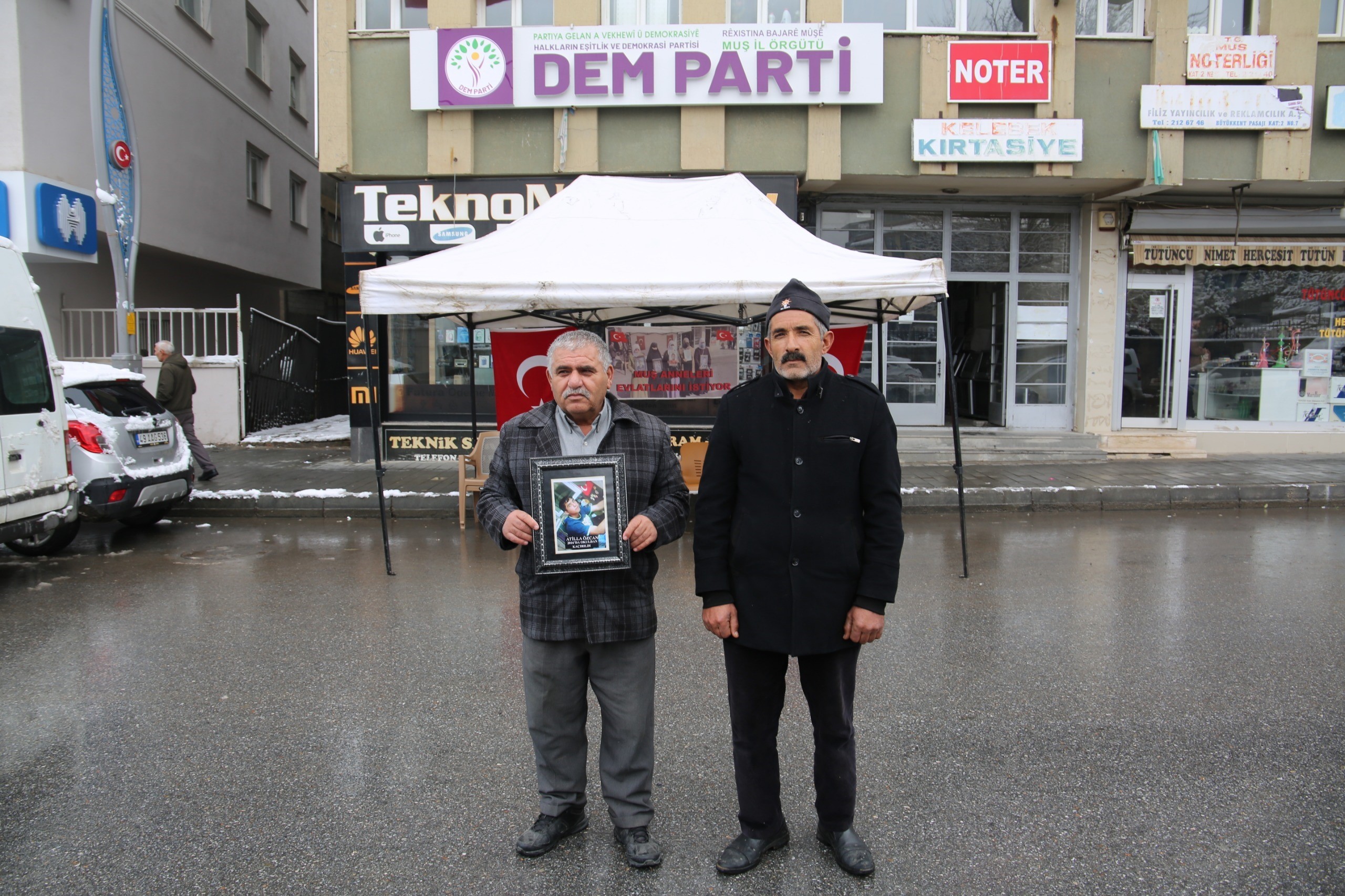 Muş'ta çocuklarının terör örgütü PKK tarafından kaçırıldığını belirten aileler, DEM Parti İl Başkanlığı önündeki eylemlerini soğuk havaya rağmen sürdürüyor. Oğluna seslenerek teslim olmasını isteyen Halit Altun, "Oğlum Muhsin eğer sağsan ve sesimi duyuyorsan çık gel. O insanların sana faydası yok. Gidip de o Yahudilere askerlik yapmayın" dedi.