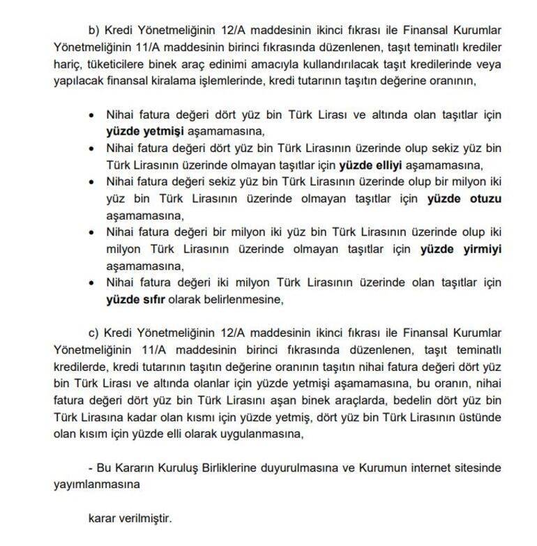 Yapılan açıklamaya göre değeri 400 bin TL ve altında olan taşıtlar için kredi tutarı yüzde 70'i aşamayacak.