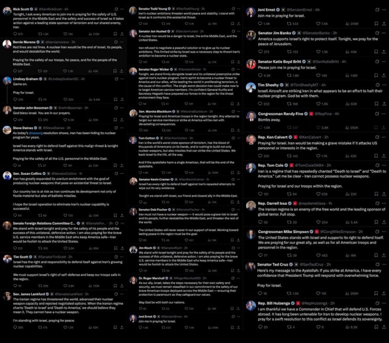 ABD Senatosu’ndan çok sayıda isim, İsrail’in “zafer”i için dua ediyor. Senatörler Rick Scott, Todd Young, Joni Ernst, Jon Husted, Roger Wicker, Kevin Cramer gibi isimler, sosyal medya hesaplarından yaptıkları paylaşımlarla İsrail’e desteklerini açıkça ortaya koydu. Senatör Roger Wicker, “İsrail’in zaferi, küresel terörizme karşı bir kalkan olacak” derken, Senatör Kevin Cramer ise, “İran’a karşı İsrail’in yanında duruyoruz” diyerek tehditkâr bir üslup benimsedi.
