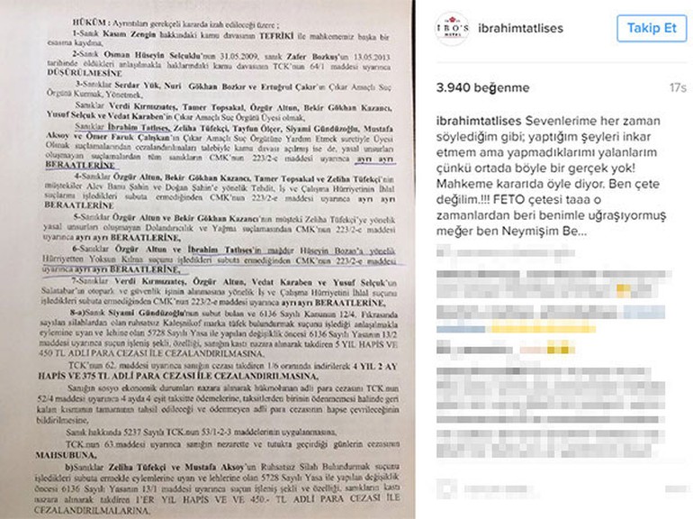 İbrahim Tatlıses’in açıklaması şöyle: "Sevenlerime her zaman söylediğim gibi; yaptığım şeyleri inkar etmem ama yapmadıklarımı yalanlarım çünkü ortada böyle bir gerçek yok! Mahkeme kararı da öyle diyor. Ben çete değilim.!!! FETÖ çetesi taaa o zamanlardan beri benimle uğraşıyormuş meğer ben Neymişim Be."