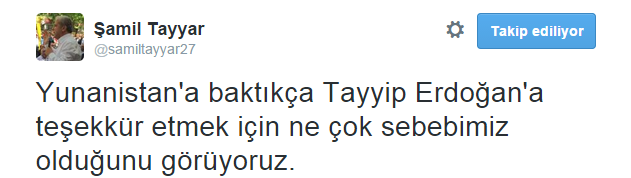 AK Parti Gaziantep Milletvekili Şamil Tayyar, Yunanistan'daki krizle ilgili "Tayyip Erdoğan'a teşekkür etmek için ne çok sebebimiz var" dedi.