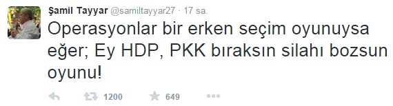 Demirtaş, Twitter hesabından, "Şu anda yürütülen bütün hava, kara, medya operasyonlarının amaçlarından biri de erken seçimlerde HDP'yi vurmaktır" iddiasında bulunmuştu. Bu iddiaya AK Parti Gaziantep Milletvekili Şamil Tayyar, yine Twitter üzerinden cevap verdi. Tayyar, "Operasyonlar bir erken seçim oyunuysa eğer; Ey HDP, PKK bıraksın silahı, bozsun oyunu!" ifadelerini kullandı.