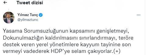 Yılmaz Tunç, “Yasama Sorumsuzluğunun kapsamını genişletmeyi, Dokunulmazlığın kaldırılmasını sınırlandırmayı, teröre destek veren yerel yönetimlere kayyum tayinine son vermeyi vadederek HDP’ye selam çakıyorlar” dedi.