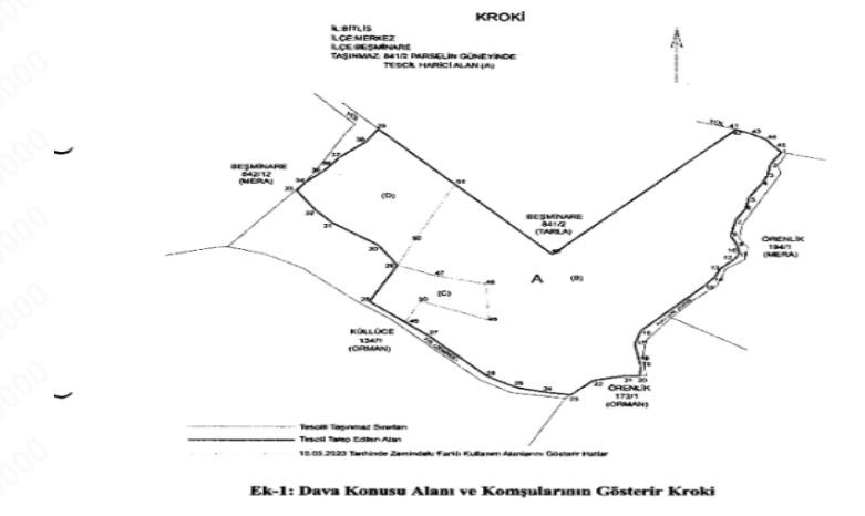 Dava konusu yerin bulunduğu alan dosyamıza sunulan 23/05/2023 havale tarihli fen bilirkişi raporundaki; dava konusu alanın ek-1 krokide kırmızı renkli kalem kullanarak A harfiyle gösterilen alan olduğu, bu alanın yüzölçümünün 71338,46 m2 olduğu, Bitlis İli, Merkez İlçesi, Beşminare Mahallesinde tescil harici alana denk geldiği, tek parça halinde talep edildiği; dava konusu alanın kuzeyinin Bitlis İli, Merkez İlçesi, Beşminare Mahallesi, 841 ada 2 parsel numaralı taşınmaz olduğu, bu taşınmazın cinsinin tarla olduğu; dava konusu alanın doğusunun ekli krokide görüldüğü üzere dava konusu taşınmazla bitişik olmamakla birlikte Bitlis İli, İlçesi, Tatvan İlçesi, Örenlik Köyü, 194 ada 1 parsel numaralı taşınmaz olduğu, bu taşınmazın cinsinin mera olduğu; dava konusu alanın güneydoğusunun Bitlis İli, Tatvan İlçesi, Örenlik Köyü, 173 ada 1 parsel numaralı taşınmaz olduğu, bu taşınmazın cinsinin orman olduğu; dava konusu alanın güneyinin ek-1 krokide görüldüğü üzere dava konusu taşınmazla bitişik olmamakla birlikte Bitlis İli, İlçesi, Merkez İlçesi, Küllüce Köyü, 134 ada 1 parsel numaralı taşınmaz olduğu, bu taşınmazın cinsinin orman olduğu; dava konusu alanın batısının Bitlis İli, Merkez İlçesi, Beşminare Mahallesi, 842 ada 12 parsel numaralı taşınmaz olduğu, bu taşınmazın cinsinin mera olduğu; dava konusu taşınmazın ek-l krokide yeşil renkli kalem kullanılarak B, C ve D harfleriyle keşif tarihindeki (10.05.2023) bitki örtüsüne göre ayrıldığı, B harfiyle gösterilen alanın yüzölçümünün 54453,24 m2 olduğu, C harfiyle gösterilen alanın yüzölçümünün 4477,08 m2 olduğu, D harfiyle gösterilen alanın 12408,14 m2 olduğu; tespit edilmiş,krokide koordinatlandırılmış olan taşınmazda hak iddia edenlerin, son ilandan başlayarak 3 ay içinde Bitlis Asliye Hukuk Mahkemesinin 2022/537 Esas sayılı dava dosyasına itirazda bulunmaları, itiraz eden bulunmaz ya da itiraz yerinde görülmez ve davacının iddialarını ispatlaması halinde taşınmazın davacı adına tesciline karar verileceği ilan olunur. 24/10/2023