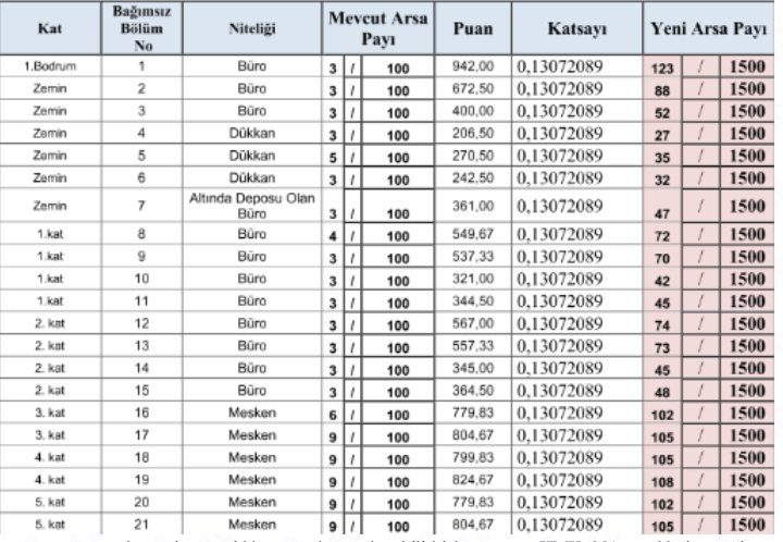 Ana taşınmazın dosya içinde yer alan kat irtifakı kurulumuna esas, mimari projesinin incelenmesi ile arsa paylarının saptanmasına esas olmak üzere bağımsız bölümlerin kat irtifakının, kurulduğu tarihteki değerlerinin hesaplanmasında, her birinin alan, konumu, biçimi ve diğer farklılıklarının göz önünde bulundurulmuş şekli ile hesabı aşağıdaki çizelgedeki gibi hâsıl olmuştur.