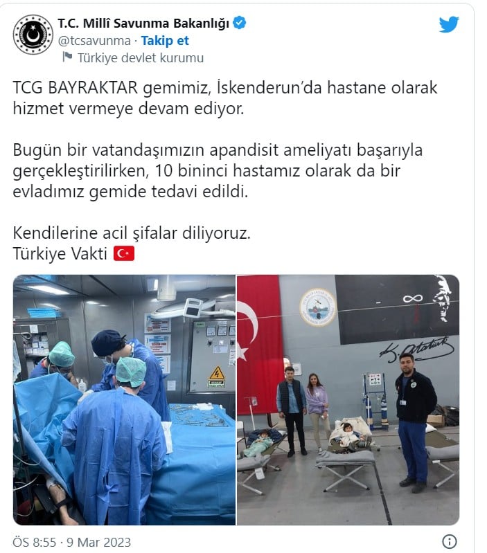 "TCG Bayraktar gemimiz, İskenderun'da hastane olarak hizmet vermeye devam ediyor. Bugün bir vatandaşımızın apandisit ameliyatı başarıyla gerçekleştirilirken, 10 bininci hastamız olarak da bir evladımız gemide tedavi edildi. Kendilerine acil şifalar diliyoruz. Türkiye Vakti."