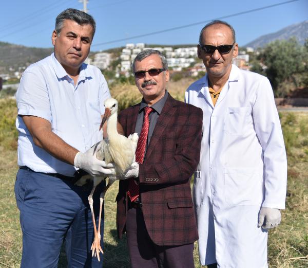 Tedavisi tamamlanan leylek, Alanya Doğa Koruma ve Milli Parklar Mühendisi Mevlüt Kodal, Alanya Belediyesi Veteriner İşler Müdürü Ali Yavuz ve veteriner hekim eşliğinde Demirtaş Mahallesi'nde bulunan sazlık alana bırakıldı.