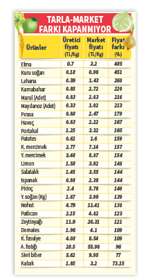 TZOB verilerine göre yaş meyve ve sebzedeki en büyük fark elmada oluştu. Elmanın üretici fiyatı ile market fiyatı arasında yüzde 485 oranında fark oluştu. Bu fark kuru soğanda yüzde 451, lahanada yüzde 268, karnabaharda yüzde 220 ve marulda yüzde 216 oldu.