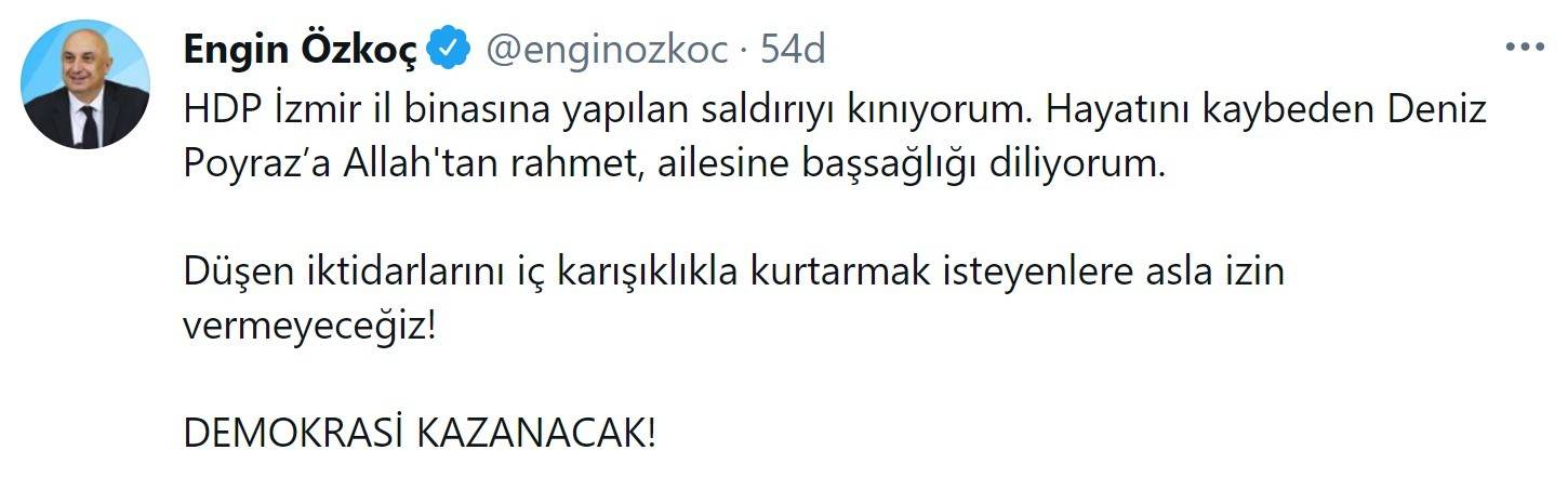 "HDP İzmir il binasına yapılan saldırıyı kınıyorum. Hayatını kaybeden Deniz Poyraz’a Allah'tan rahmet, ailesine başsağlığı diliyorum. Düşen iktidarlarını iç karışıklıkla kurtarmak isteyenlere asla izin vermeyeceğiz! Demokrasi kazanacak."