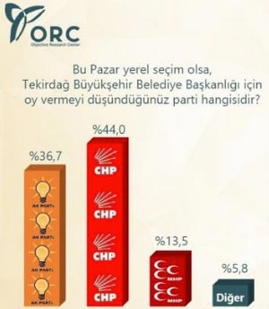 Anket şirketlerinin Tekirdağ yerel seçim sonuçlarına ilişkin verilerini açıklamadı. Ancak ORC araştırma daha önceden Tekirdağ yerel seçim anket sonuçlarını açıklamıştı.