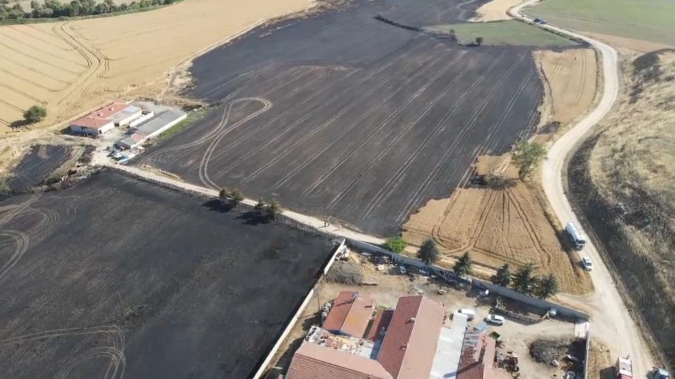 Tekirdağ’ın Saray ilçesinde çıkan tarla yangınında yaklaşık 100 dönüm ekili arazi kül oldu, yangın sonrası yanan alan dron ile havadan görüntülendi.