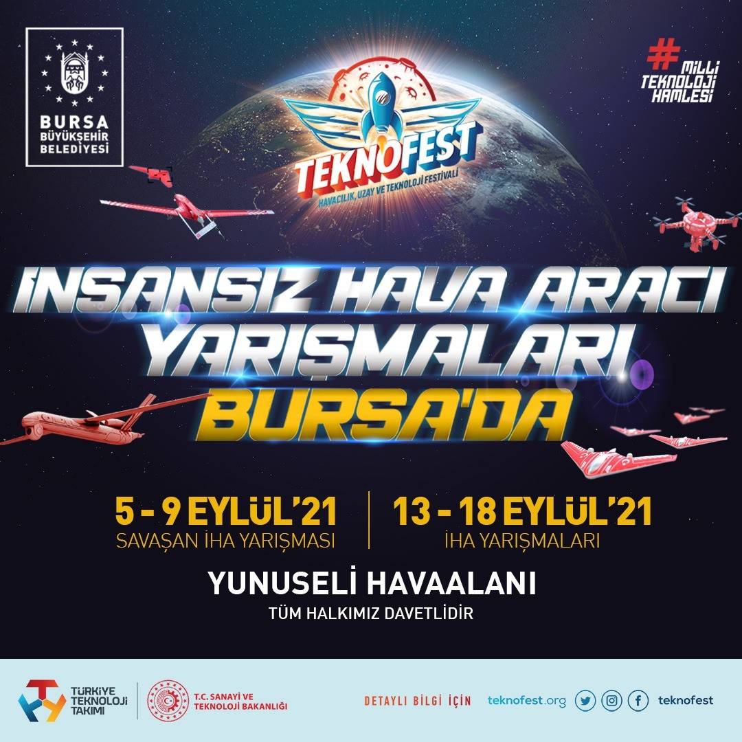 TEKNOFEST kapsamında Bursa Büyükşehir Belediyesi’nin destekleriyle düzenlenecek olan Savaşan İHA Yarışması 5-9 Eylül, Uluslararası İHA Yarışması ve Liseler Arası İHA Yarışması ise 13-18 Eylül tarihleri arasında Bursa Yunuseli Havalimanı’nda gerçekleştirilecek.