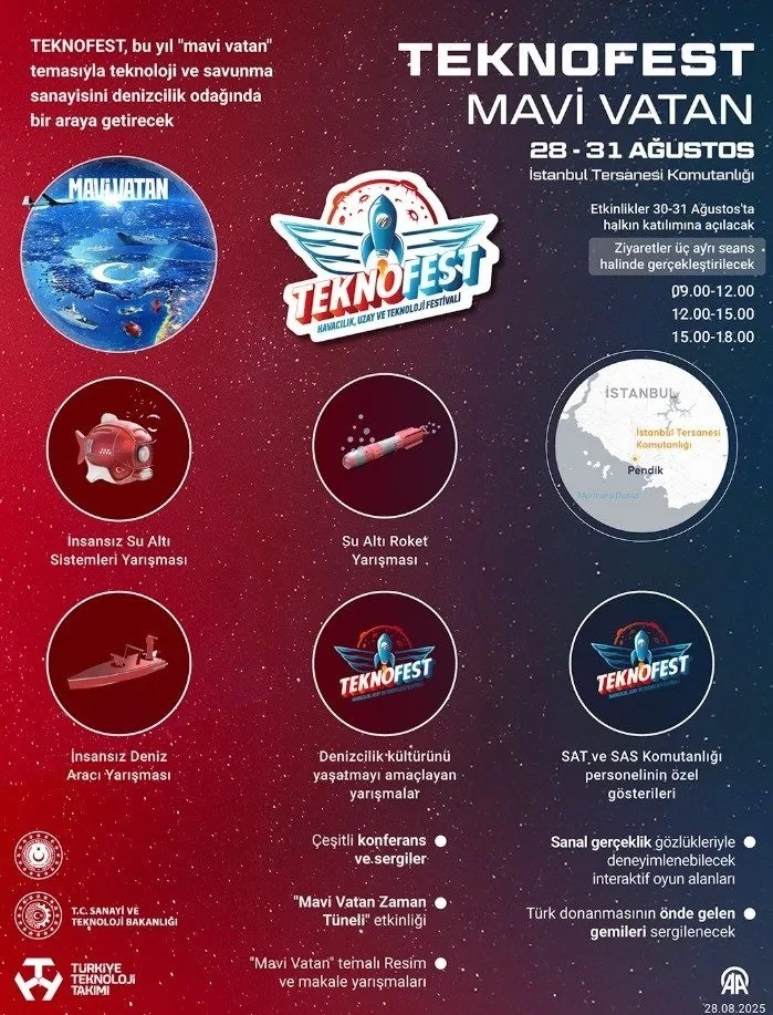 Milli Teknoloji Hamlesi vizyonunun denizlerdeki yansıması, "TEKNOFEST 2025 kapsamında düzenlenecek "TEKNOFEST Mavi Vatan" ile bu yıl yeni bir boyut kazanacak. Dünyanın En Büyük Havacılık, Uzay ve Teknoloji Festivali TEKNOFEST, bu yıl ilk kez Mavi Vatan’da düzenleniyor! Herkesin heyecanla beklediği unutulmaz etkinlikler ve yepyeni sürprizlerle festival coşkusu denizlere taşınıyor. Peki, Teknofest Mavi Vatan nerede? İşte 2025 TEKNOFEST Mavi Vatan etkinlik takvimi