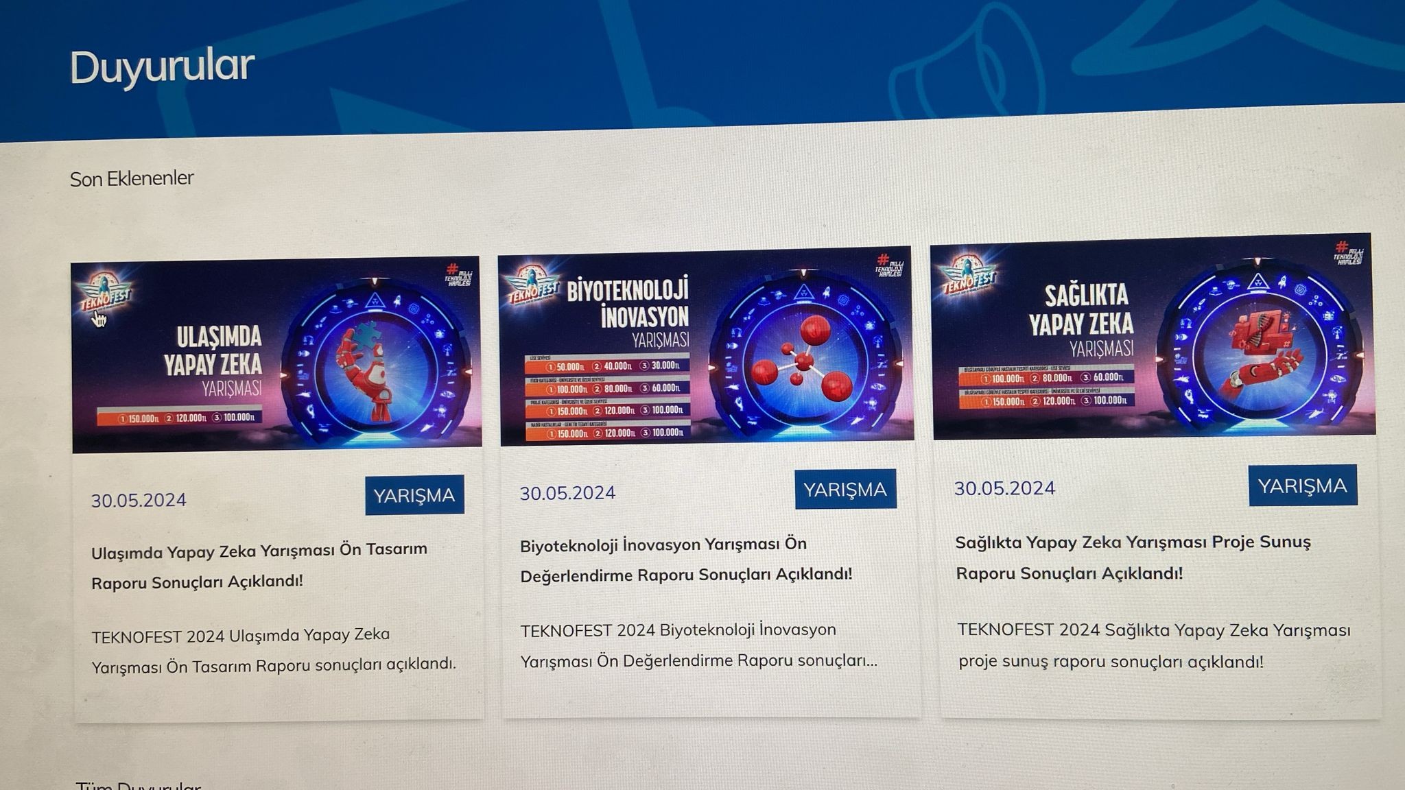 Sonuçlara Teknofest'in internet sitesindeki duyurular kısmından ulaşılabiliyor.