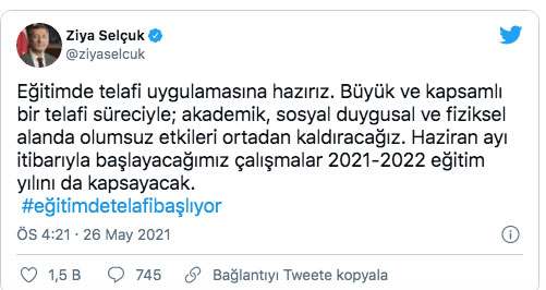 Milli Eğitim Bakanı Ziya Selçuk, Twitter hesabından yaptığı paylaşımda şu ifadelere yer verdi:"Eğitimde telafi uygulamasına hazırız. Büyük ve kapsamlı bir telafi süreciyle; akademik, sosyal duygusal ve fiziksel alanda olumsuz etkileri ortadan kaldıracağız. Haziran ayı itibarıyla başlayacağımız çalışmalar 2021-2022 eğitim yılını da kapsayacak." Telafi eğitimin zorunlu olup olmayacağına ilişkin MEB'den henüz bir açıklama gelmedi.