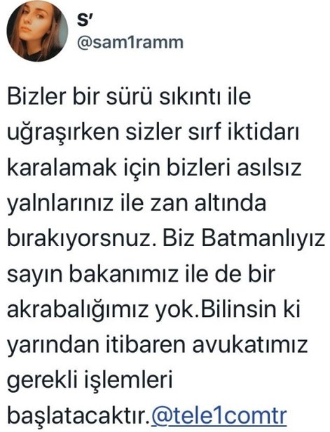 Emrullah Gülüşken'in kendisi ile Türkiye'ye delen gelen ortanca kızı Samira Gülüşken, TELE1 Televizyonu'nun iddialarını yalanladı ve "Bizler bir sürü sıkıntı ile uğraşırken sizler sırf iktidarı karalamak için bizleri asılsız yalanlarınız ile zan altında bırakıyorsnuz. Biz Batmanlıyız sayın bakanımız ile de bir akrabalığımız yok. Bilinsin ki yarından itibaren avukatımız gerekli işlemleri başlatacaktır" dedi.