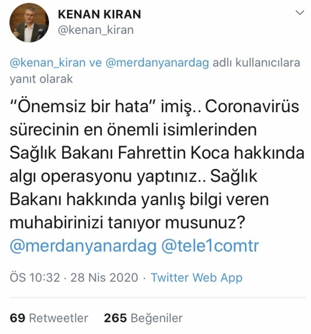 CHP yandaşı TELE1'in Genel Yayın Yönetmeni Merdan Yanardağ, Sağlık Bakanı Fahrettin Koca ve Emrullah Gülüşken ile ilgili yalan haber yapan Seda Şanlıer’i akıllara durgunluk veren sözlerle savundu. Yanardağ, "Olgusal bir hata.. Adı geçen kişi Konyalı değil, Batmanlı. Bu önemsiz hatayı yapan da biz değiliz, bağlantı kurduğumuz kişi. Ama haberin esası doğru" ifadelerini kullandı.