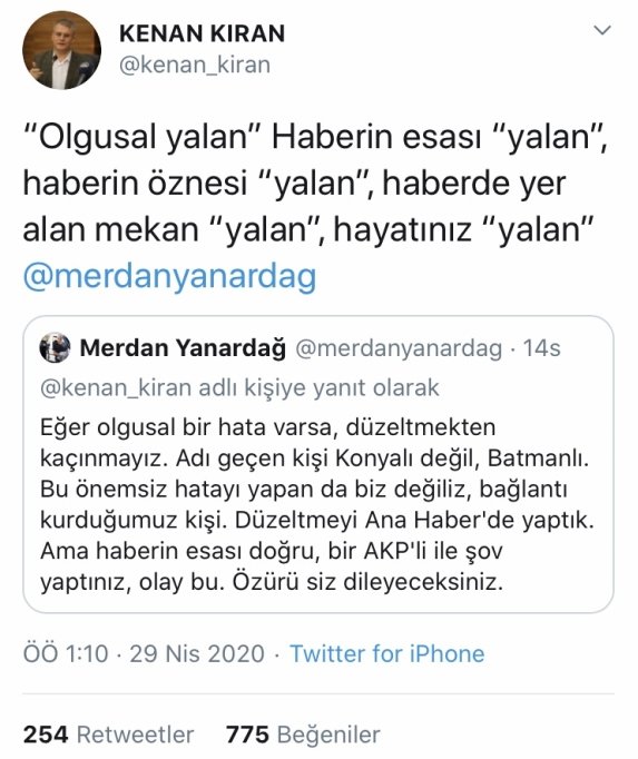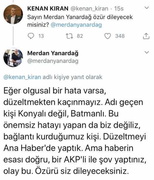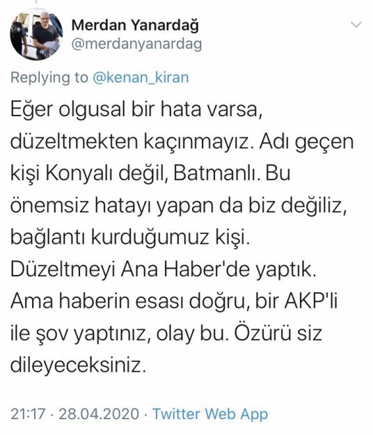 "Eğer olgusal bir hata varsa, düzeltmekten kaçınmayız. Adı geçen kişi Konyalı değil, Batmanlı. Bu önemsiz hatayı yapan da biz değiliz, bağlantı kurduğumuz kişi. Düzeltmeyi Ana Haber'de yaptık. Ama haberin esası doğru, bir AKP'li ile şov yaptınız, olay bu. Özürü siz dileyeceksiniz."