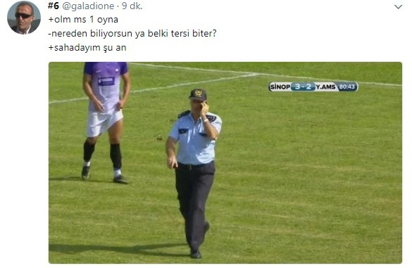Sinopspor ile Yeni Amasyaspor arasındaki Ziraat Türkiye Kupası eleme karşılaşmasının 80. dakikası oynanırken elindeki cep telefonuyla görüşme yaptığı sırada dalgınlıkla sahaya giren 3. sınıf emniyet müdürü futbolcuları şaşırttı.