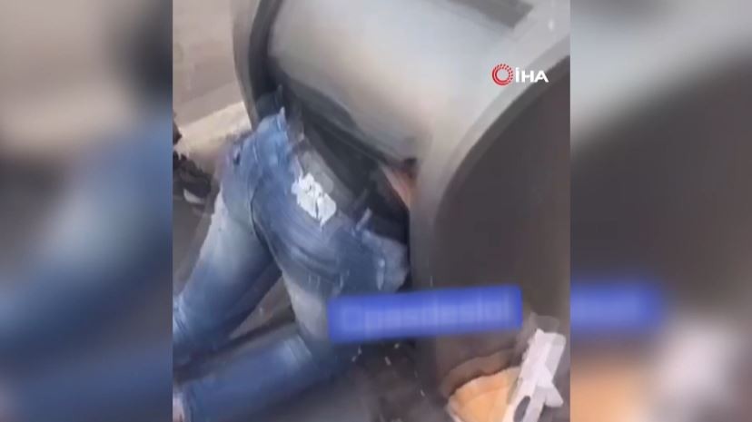 Sosyal medyada paylaşılan görüntülerde çöp konteynerine sıkışan kişinin durumunun iyi olduğu görüldü.