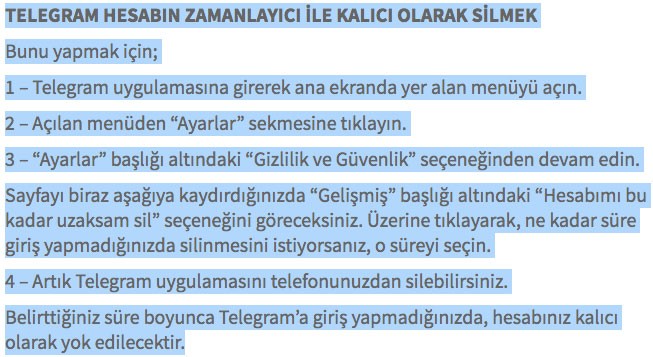 Telegram hesap silme, Telegram hesabı kalıcı olarak silme nasıl yapılır, Telegram hesabı nasıl silinir? soruları WhatsApp’ın gizlilik sözleşmesi dayatmasından sonra Telegram hesabı açan ancak, Telegram hesabını silmek isteyenlerce merak ediliyor. Peki Telegram hesabımı kalıcı olarak nasıl silerim? İşte Telegram hesabı tamamen silme işlemi.