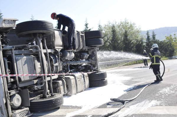 İzmit'te, TEM otoyolunda sürücüsünün direksiyon hakimiyetini kaybettiği oksijen yüklü tanker, bariyerlere çarparak devrildi. İtfaiye köpük sıkarak önlem alırken, AFAD ise ortam gazı ölçümü yaptı. Kazada sürücü hafif yaralandı.