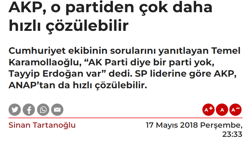2018'de Cumhuriyet'ten Erdem Gül'e konuşan Karamollaoğlu, AK Parti'nın ANAP'tan hızlı bir şekilde çözülerek yok olacağını söylemişti.