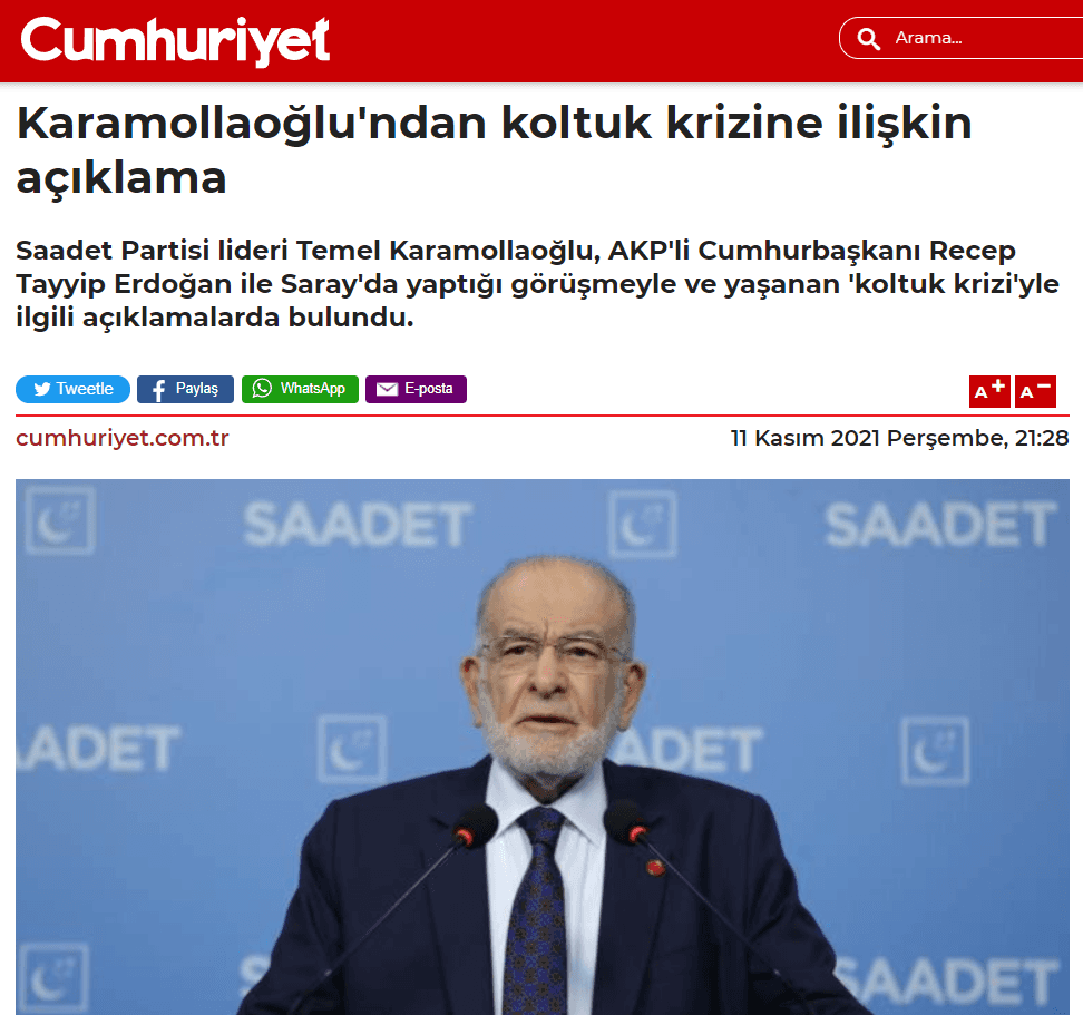 Saadet Partisi Genel Başkanı Temel Karamollaoğlu, Sözcü, Cumhuriyet, TELE 1 ve avanelerinin "Saray'da koltuk krizi" yalanına, "Bu bana göre abartıldı." diyerek cevap vermişti. Kendilerine verilen cevabı manşetine taşıyan Cumhuriyet gazetesi, yazdıkları ile "yuh" dedirtti.