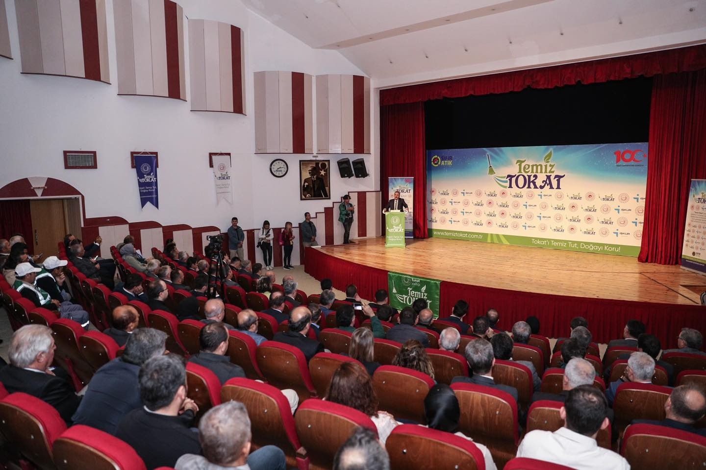 Tokat’ın kırsalını, ilçelerini, beldelerini ve köylerini; çevresel sürdürülebilirlik, temizlik eğitimi, kamusal katılım ve yenilikçi çözümlerle daha iyi bir geleceğe taşımayı amaçlayan Temiz Tokat Projesi için 26 Haziran Atatürk Kültür Saray’ında gerçekleştirilen tanıtım programına; Vali Numan Hatipoğlu, Vali Yardımcıları Osman Sarı, Harun Kazez, İlçe Kaymakamları, İl Emniyet Müdürü Armağan Adnan Erdoğan, İl Jandarma Komutanı Albay Sabri Hüyük, İl Genel Meclisı Başkanı Erol Duyum, belediye başkanları, kurum müdürleri ve öğrenciler katıldı.