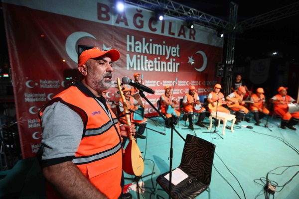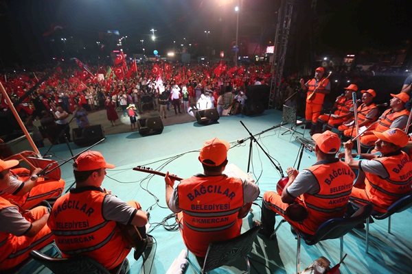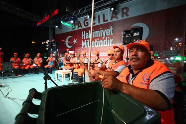 Cumhurbaşkanı Recep Tayyip Erdoğan’ın çağrısıyla her gün nöbet tutan Bağcılarlılar, “bayrak inmez, vatan bölünmez” sloganlarıyla meydanı inletiyor. Ellerindeki Türk bayraklarını dalgalandıran ilçe sakinlerini kutsal nöbetlerinde Bağcılar Belediyesi Temizlik İşçileri Korosu da yalnız bırakmadı. 13 kişiden oluşan müzik korosu çöp kovası, kar küreği ve faraşın da aralarında bulunduğu enstrümanlarıyla kahramanlık türkülerini seslendirdi. Binlerce Bağcılarlı Türkiyem, Çanakkale Türküsü, Şehitler Ölmez gibi destanlaşan ve dilden dile yayılan türküleri söylerken nöbettekiler de onlara eşlik etti.