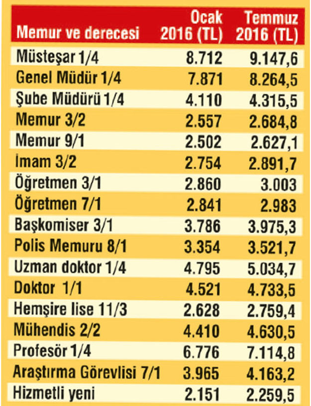 Temmuz ayı birçok kesimle birlikte memurlar için de zam ayı oluyor. Yapılan toplu sözleşme gereğince memurlar ve memur emeklileri Ocak ile birlikte Temmuz'da da zam alıyor. Buna göre Ocak ayında yüzde 6 zam ve yüzde 0.90 enflasyon farkı alan memurlar ve memur emeklileri Temmuz'da da yüzde 5 artış alacak. Maaşlarına yansıyacak bu artış dışında enflasyon farkı ihtimali de var. Buna göre 4 Temmuz'da açıklanacak enflasyon rakamlarıyla birlikte son 6 aylık enflasyon yüzde 6 ve yukarısında çıkarsa memurlara ve memur emeklilerine aradaki fark da ödenecek. Memur-Sen'in verilerine göre; en düşük memur maaşı (bekar) Aralık 2015 itibariyle bin 906 lira idi. Ocak ayında yüzde 6 + yüzde 0.90 artışın yansıtılmasıyla en düşük memur maaşı 2 bin 38 lira 54 kuruşa çıktı. Temmuz'daki yüzde 5'lik toplu sözleşme zammıyla da bu maaş yaklaşık 102 lira artışla 2 bin 140 lira 46 kuruşa ulaşacak.