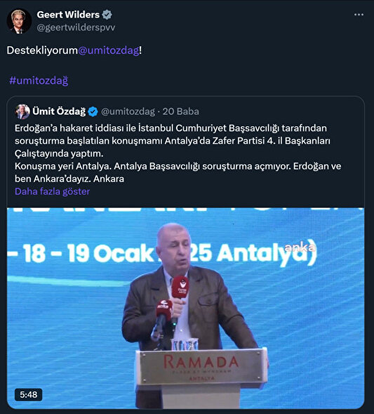 Ümit Özdağ'a destek Hollanda'dan geldi. Hollanda'daki seçimlerde 'göçmen karşıtı' siyasetiyle seçim kazanan ve koltuk sayısını ikiye katlayan ırkçı Özgürlük Partisi'nin (PVV) Genel Başkanı Türk ve İslam düşmanı Geert Wilders, X hesabından Özdağ'ın konuşmasını alıntılayarak "Özdağ'ı destekliyorum" dedi.