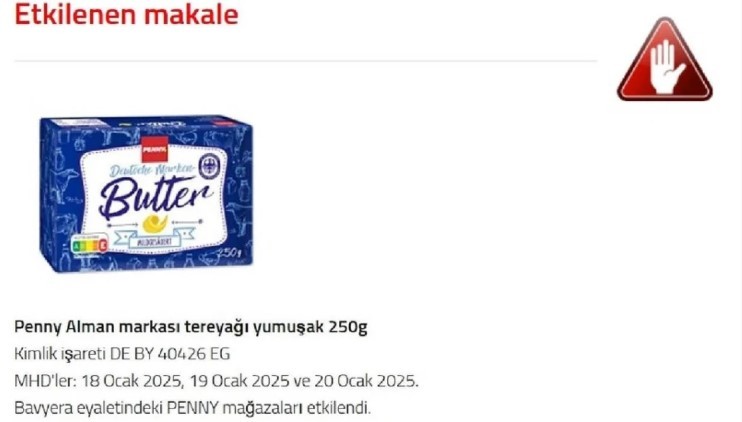 Aynı zamanda, Penny German markası adı altında satılan, DE BY 40426 EG tanımlama koduna sahip 250 gramlık tereyağı yumuşak ürünleri de geri çağrılıyor. Bu ürünlerin son kullanma tarihleri 18 Ocak 2025, 19 Ocak 2025 ve 20 Ocak 2025 olarak belirtiliyor.