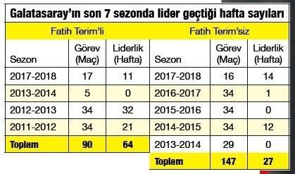 Fatih Terim ile daha az maça çıkmasına rağmen neredeyse 3 kat daha fazla liderlik koltuğunda oturan sarı-kırmızılılar, 34. haftada istediğini alması durumunda son 7 sezonda Terim ile bitirdiği 3 sezonu da şampiyon olarak kapatmış olacak.