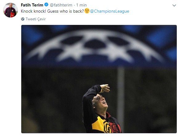 Fatih Terim, Twitter hesabından İngilizce ''Knock knock! (Kapı çalma sesi) Guess who is back? (Tahmin edin kim döndü?)'' tweetini attı. Tecrübeli teknik adam attığı tweette Şampiyonlar Ligi hesabını etiketledi.