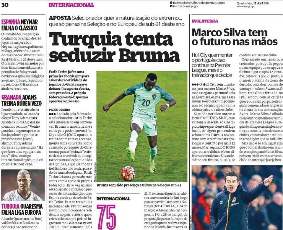 Haberde oynadığı verimli futbola rağmen hala A Takıma alınmadığı belirtilen Bruma'nın konuyla ilgili düşüncesine yer verilmezken Portekiz federasyonunun gelecek projelerinde Bruma'nın da yer aldığı belirtildi.